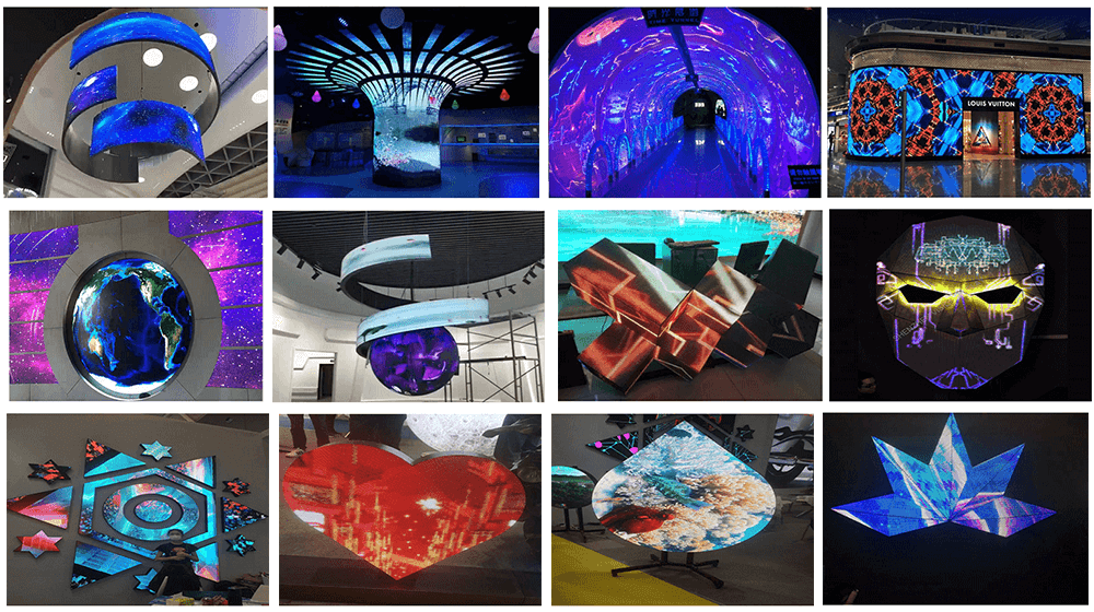 Creative customization of LED display screens not only for customization in size, but also in shape. Compared with traditional rectangular LED displays, curved LED displays, cylindrical LED screens, streamers, waves, and various strange shaped screens have been added to enhance the atmosphere of the scene.